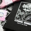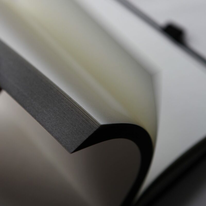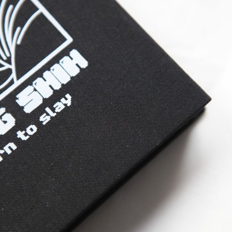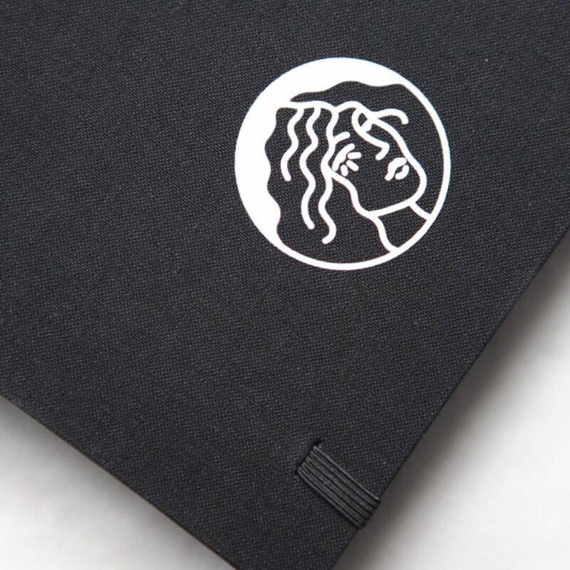 Notatnik Osobliwy w materiałowej oprawie. Posiada z boku gumkę na długopis, osobną gumkę do zamknięcia notatnika, wstążkę do zaznaczania stron oraz papierową kieszonkę z tyłu. Format A5, 96 pustych kartek, które z boku barwione są na czarno dla efektu dekoracyjnego. Nadruk na materiale z przodu (grafika Ching Shih) oraz z tyłu (logo).